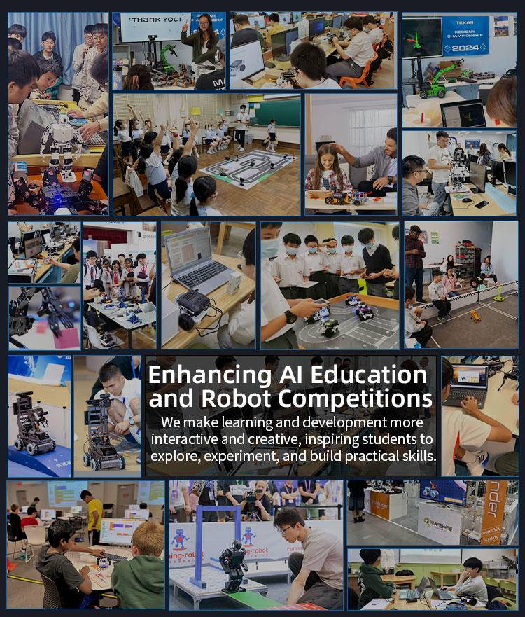 Our mission is to provide high-quality robots and tailored services to users of all ages. With numerous patents in servo drive, motion control algorithms, and deep vision, we create innovative solutions based on open-source hardware platforms. To date, Hiwonder has launched over 100 educational robots, all designed and manufactured in-house, serving more than 50,000 schools worldwide. We offer comprehensive AI courses and solutions that support the advancement of AI technology and education.