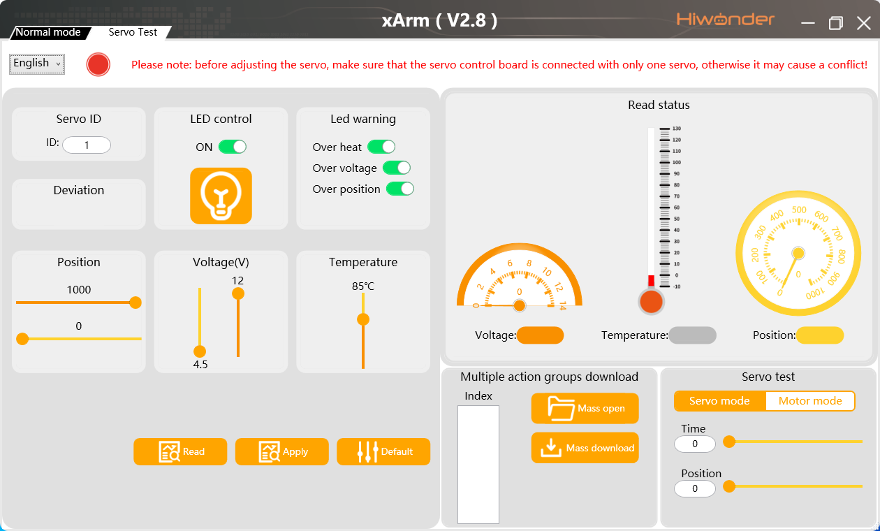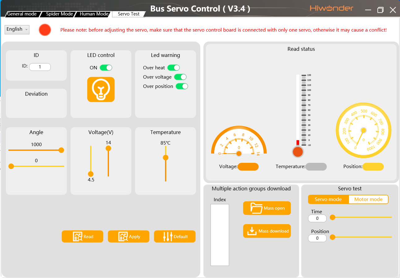With our servo debugging tool, you can easily configure the servo ID, operating mode, speed, position offset, and set alarms for stall and low voltage. You can also adjust LED light, temperature, and speed. Th graphical interface allows you to adjust each servo’s angle with a simple drag-and-drop, making it quick and easy to create motion files and enhance debugging efficiency.