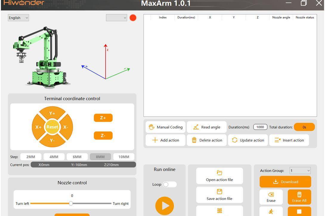 MaxArm's visual debugging tool helps you adjust servo parameters, create action groups, control coordinates, and even manage nozzle function. With an easy-to-use interface, you can quickly copy motion configurations and debug settings, meeting all your robot development needs.